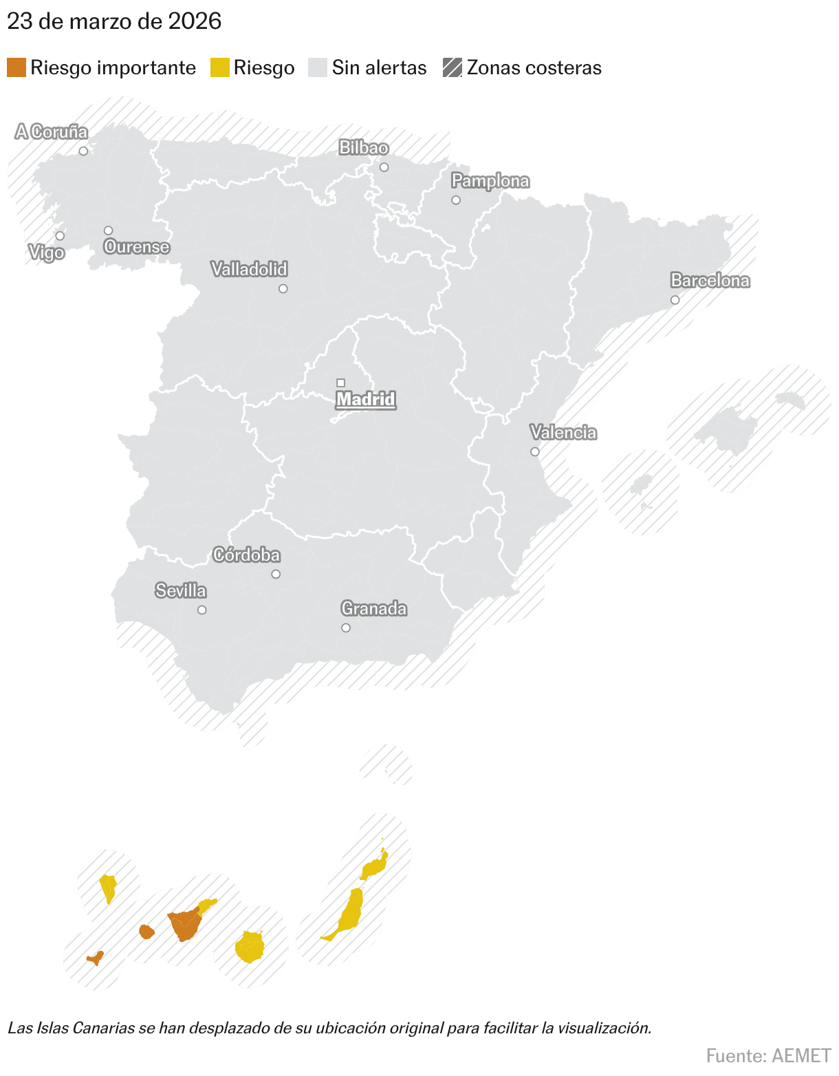 Las temperaturas nocturnas subirán en el este y en Baleares, pero bajarán en el oeste peninsular. Además, no se descartan heladas débiles en zonas de montaña del norte. En Canarias, por su parte, apenas habrá cambios en los termómetros.