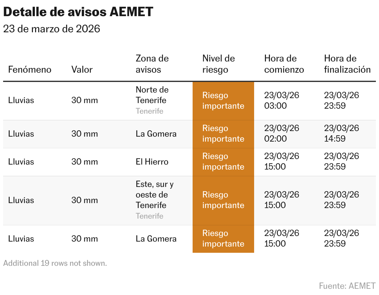 La borrasca Therese sigue marcando el tiempo este lunes en Canarias. Las islas de La Gomera, El Hierro y Tenerife se encuentran en nivel de riesgo importante por lluvias, mientras que también hay avisos por tormentas en La Palma. En el resto del archipiélago continúan activos los avisos, aunque de menor intensidad.. Seguir leyendo